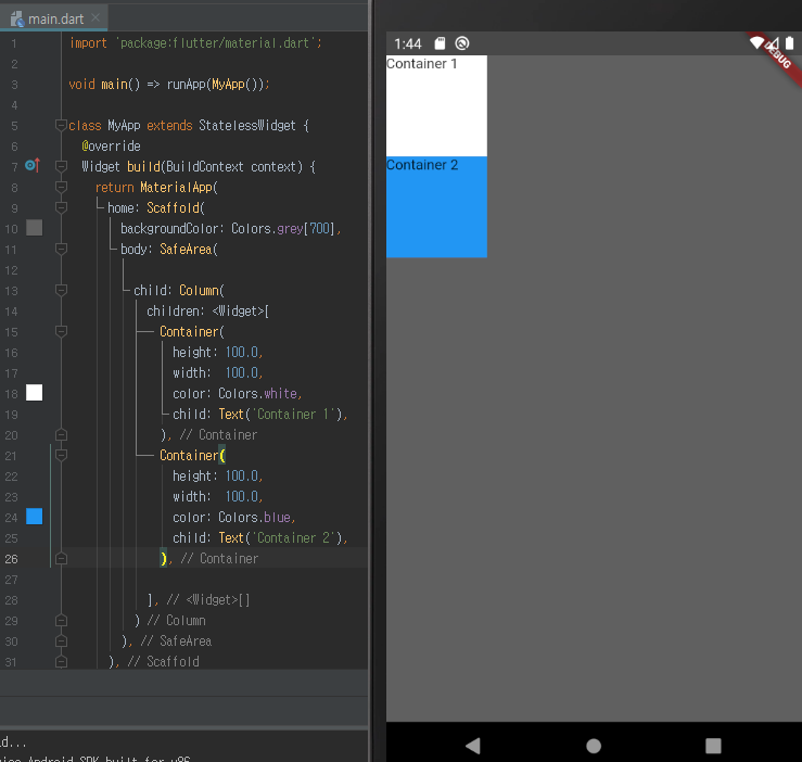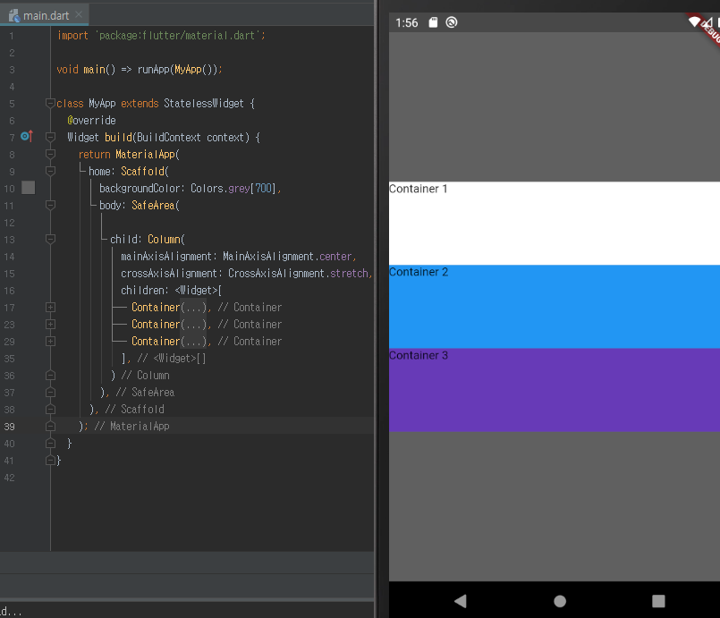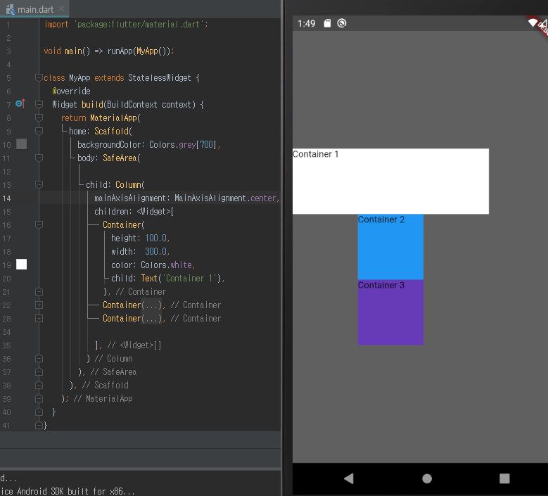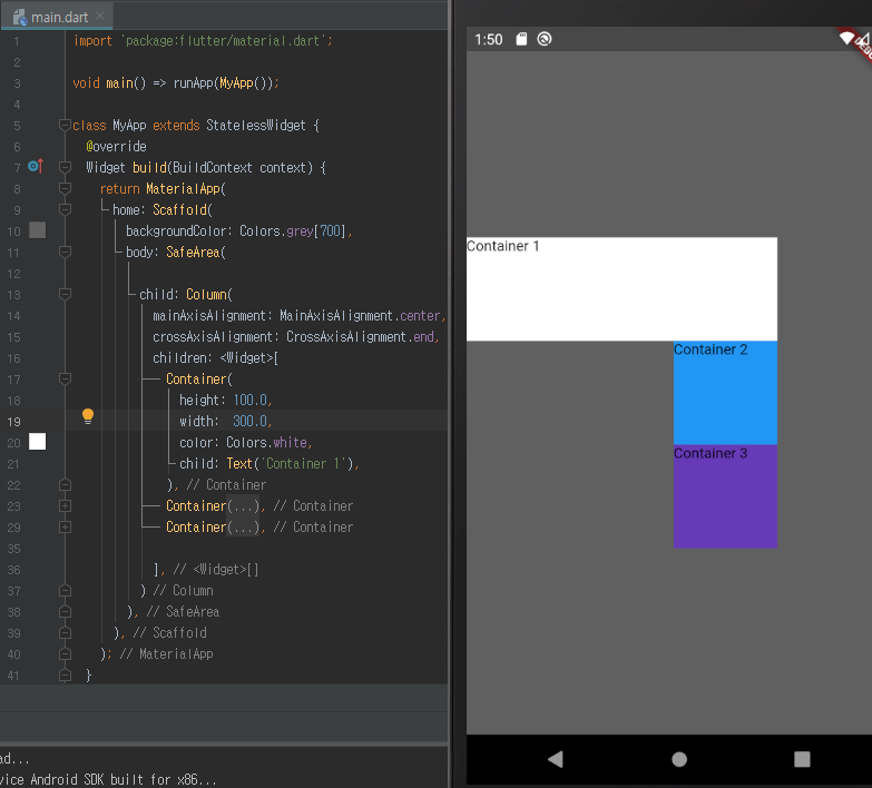 Column에서 children Widget을 활용하여 여러개의 Container를 배치가능.