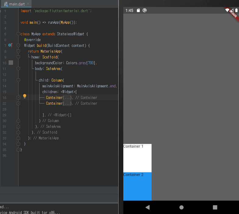 crossAxisAlignment: CrossAxisAlignment.end, 를 추가하여 수평방향으로 정렬가능. (아래 2개 사진 참조)