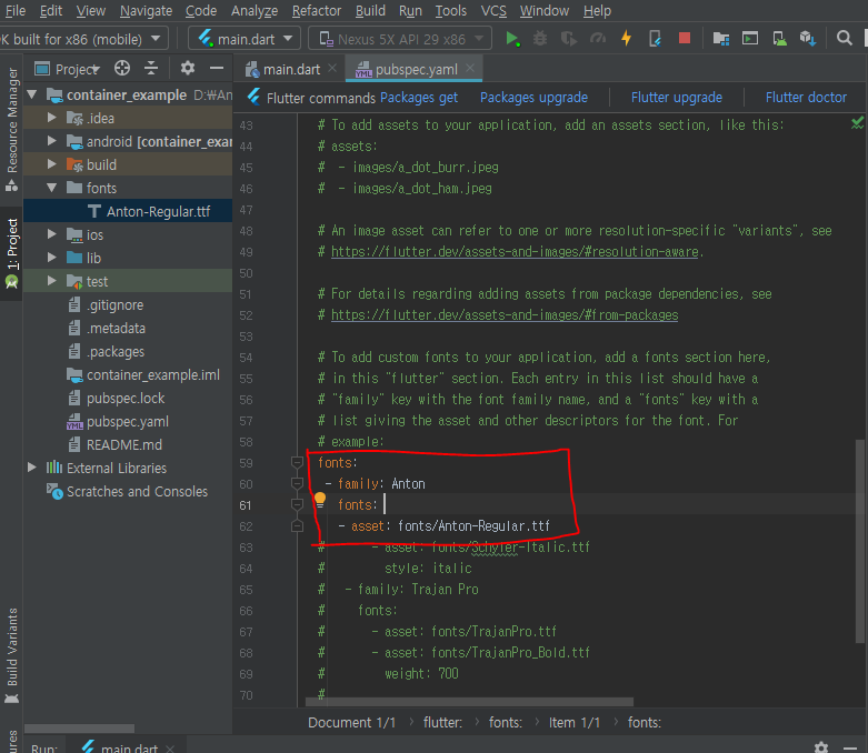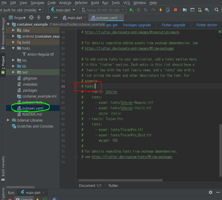 형광색으로 칠해진 pubspec.yaml 을 열고 font를 찾는다.