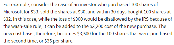 그 후에 30일 이내에 $32불에 100주를 $3,200 매수할 경우 매수금액을 $3,200 +$300(이전 손실)로 잡아서 포지션 청산 시 회계상 매수 금액을 $3,500으로 잡아준다. 즉 해당 주식을 청산 시에는 이전에 손실을 그대로 보존해서 매수 평단가에 그걸 더해주는 식이다.