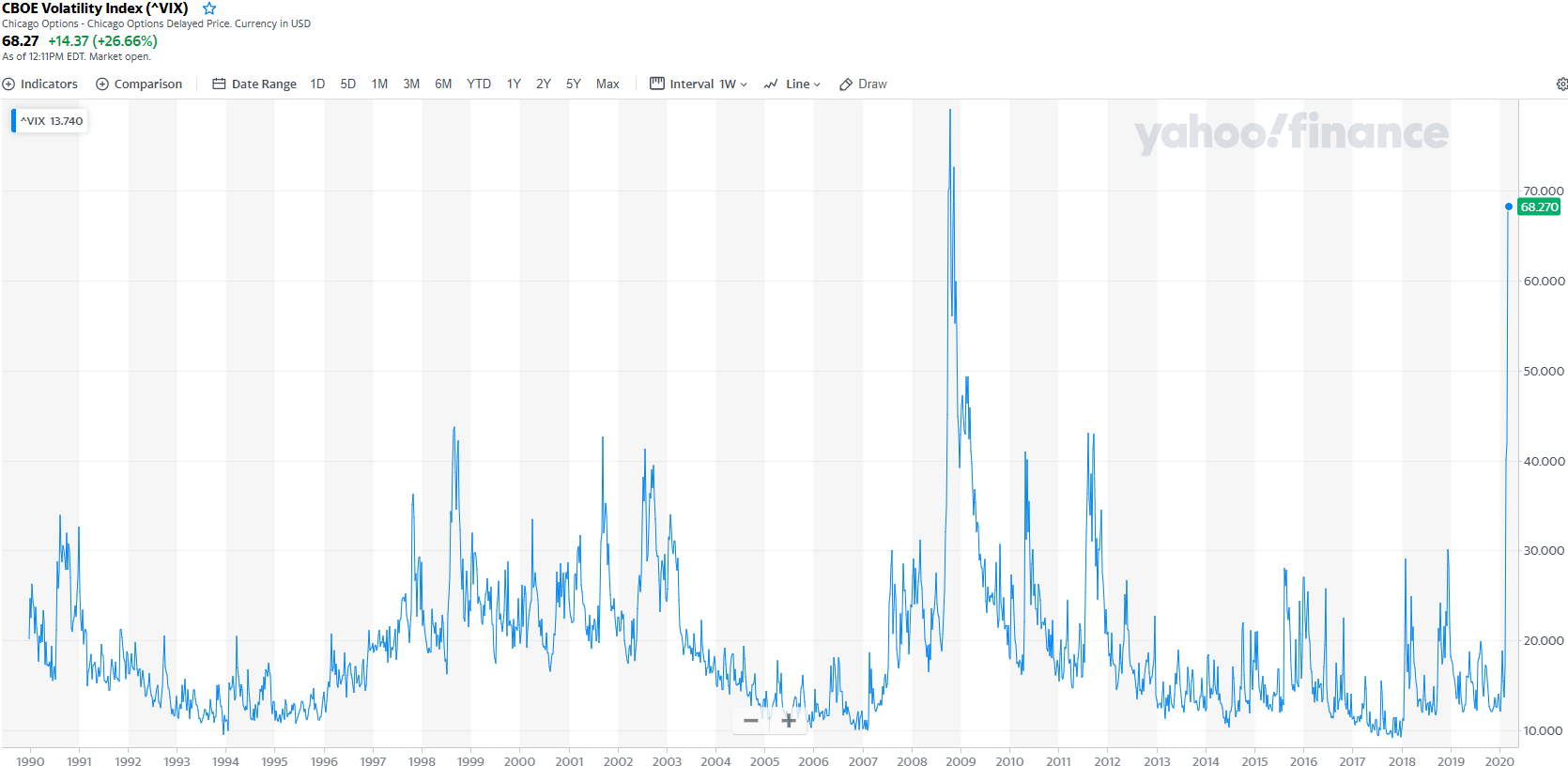 1990년부터 2020년 3월 12일까지 S&P 500의 VIX Index