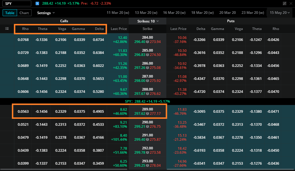 델타 0.4905는 기초자산의 변동에 따른 옵션의 가격 변화이다. 기초자산이 1 움직일때마다 옵션가격이 대략 0.49 움직인다. 가운데 보면 현재가(종가)가 $288.42인데 이게 만약에 $1불 상승하여 $298.42가 되면 대략 델타지표에 따라서 옵션가격이 $8.62 에서 0.4905가 추가된 대략 옵션 1계약에 $862에서 $911 ($9.11 x 100)이 되는 것이다.