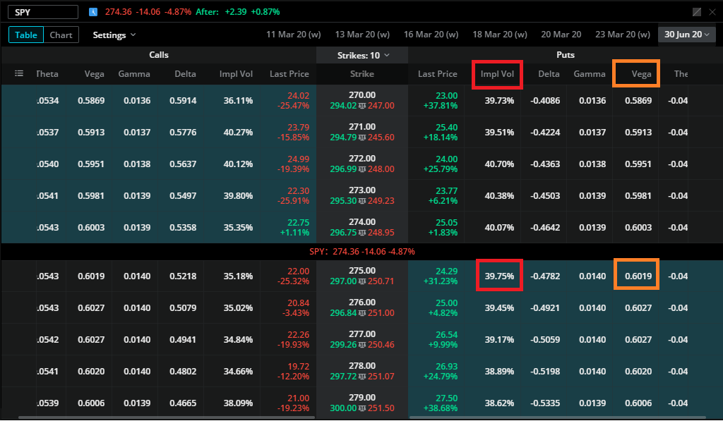 베가는 변동성과 관련된 지표이다. 내재 변동성 IV(Implied Volatility)가 1% 변동 시 옵션가격의 변화율이다. 즉, 아래 테이블에서 275풋 옵션을 볼경우 Vega가 0.6019이며 IV가 39.75%이다. 만약에 다른 지표를 제외한 IV만 40.75%로 상승할 경우 풋옵션의 가격은 대략 $24.29 에서 $24.89 로 상승한다.