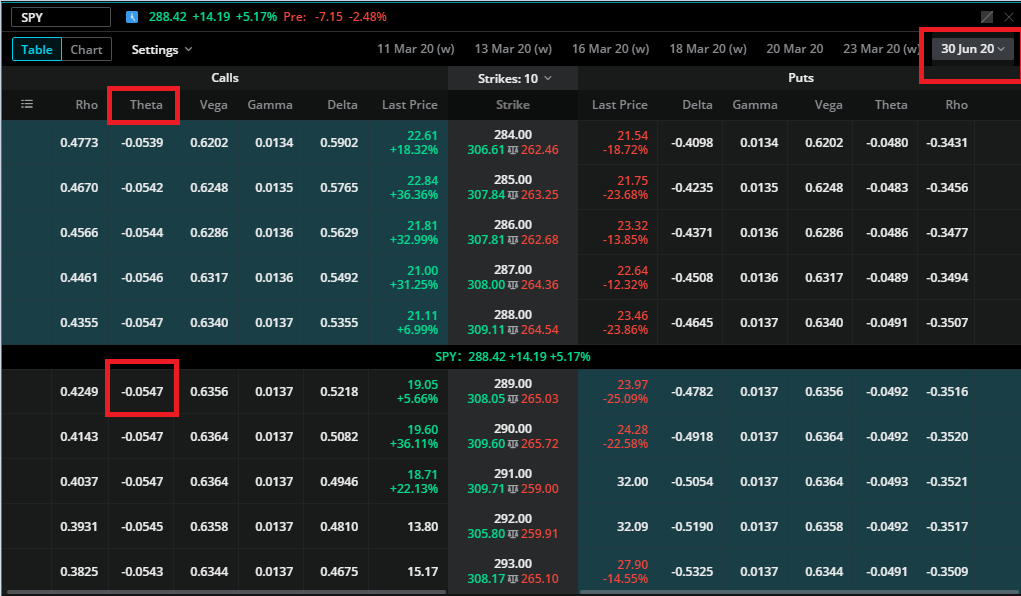세타는 당일 거래일에 시간으로 인한 손실이 얼마나 발생하는지 나타내는 정도이다. 가격에 변동이 없을 시에 하루에 대략 투자금액에 14.56% 정도 손해가 발생한다고 생각하면된다. 위의 경우 만기가 2주일 남은 콜옵션이다. 만약에 아래 테이블과 같이 만기가 많이 (3개월 정도) 남아 있는 옵션상품의 경우는 세타가 상당히 낮은걸 볼 수 있다.