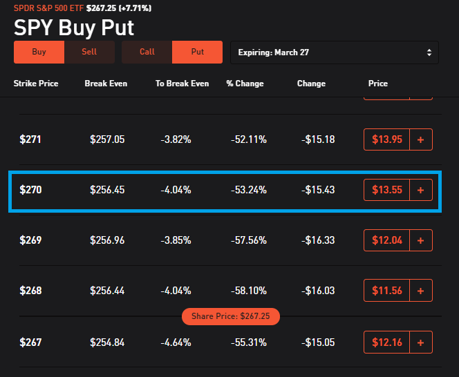 자 여기서는 3월 27일이 만기인 $270 풋옵션을 매수하고 SPY ETF가 아주 조금 떨어져서 $260에 도달했다고 가정해보자. 풋옵션을 매수를 위해 투자한 금액은 총 $1,355이었다. 우리가 매수한 풋옵션은 결제 가격이 $270.00이기 때문에 종가 $260.00인 경우에 1주당 $270.00에 매도할 수 있는 권리가 생긴다.