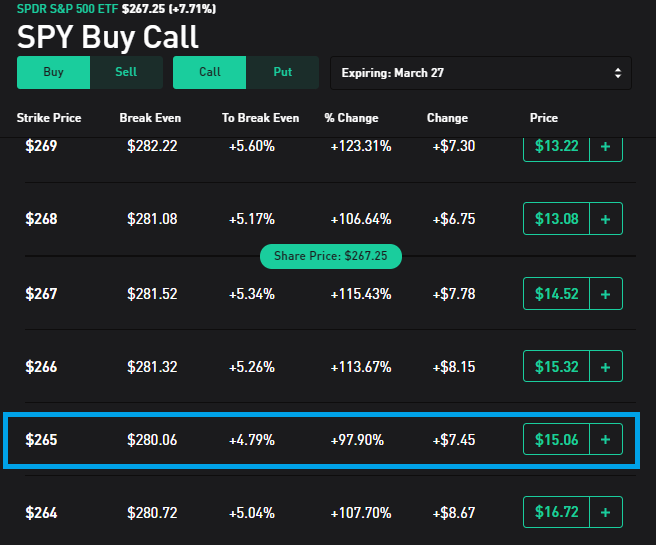 다르게 말하자면, 현재 결제금액 $265에 3월 27일 만기인 콜옵션의 프리미엄은 $1281불이다.