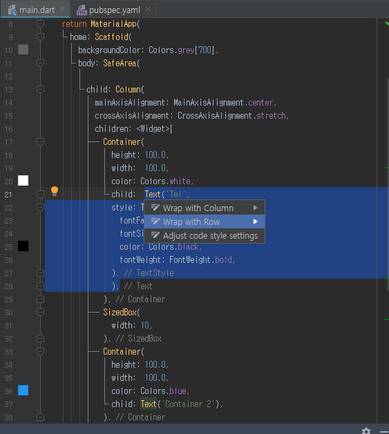 컨테이너 내부에 Row를 추가하고 childred: widget을 추가한후