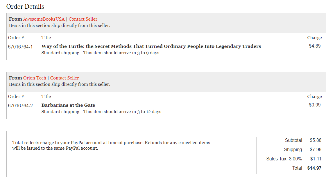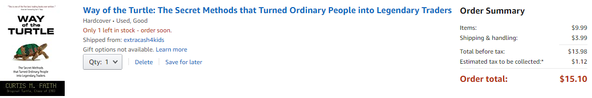 책 두 권에 배송비 그리고 텍스 포함 15불!!! (정말 저렴하다. 피자 1판 가격도 안 한다.)