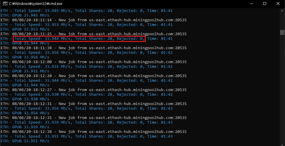 이제 start.bat 파일을 더블클릭하여 실행하면 아래와 같은 cmd 창이 뜨면서 채굴이 되는 걸 확인 할 수 있습니다.