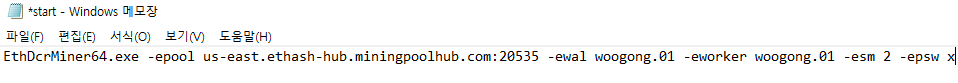 예를 들어 마이닝풀 허브 아이디가 woogong 이라면, username = woogong 이고 workername은 임의로 01로 할당하면 됩니다.