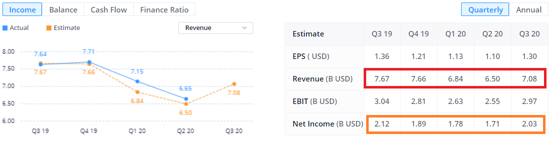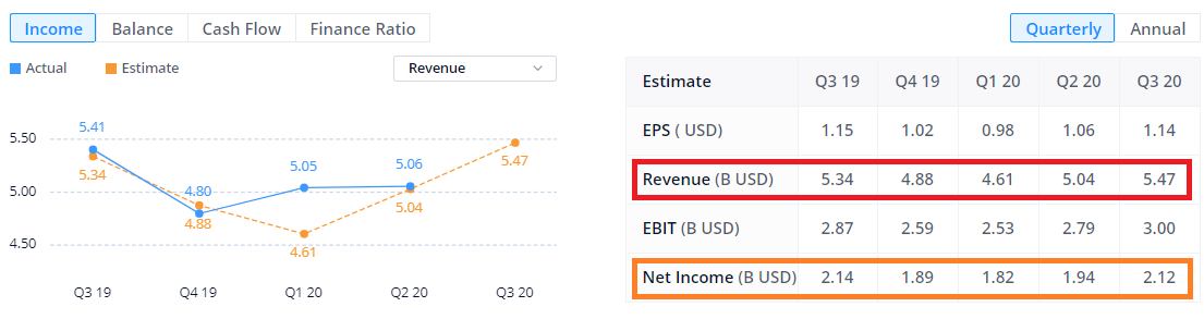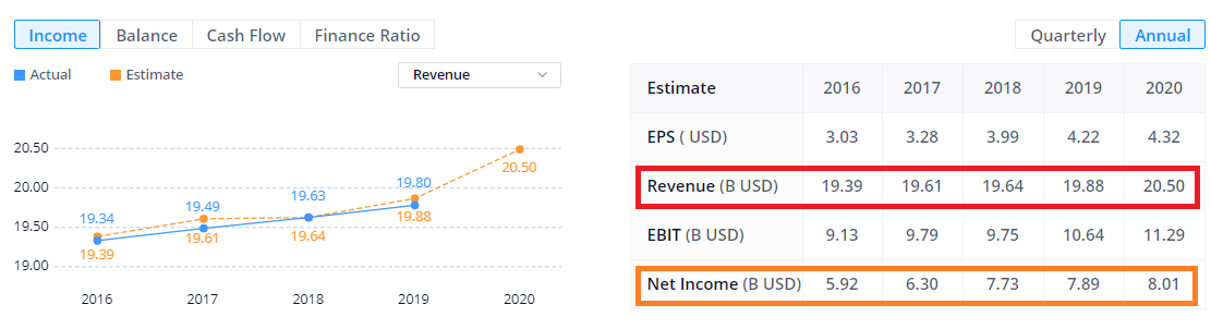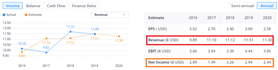 Revenue: 매출액 (아래 대문자로 B라 적혀 있는거는 Billion Dollar를 뜻함), 1Bilion = 1조원 (대략적으로)