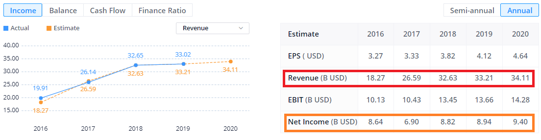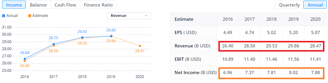 Revenue: 매출액 (아래 대문자로 B라 적혀 있는거는 Billion Dollar를 뜻함), 1Bilion = 1조원 (대략적으로)