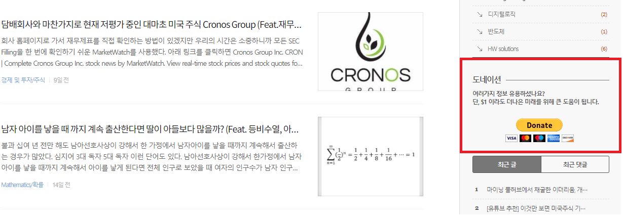 현재 위 사진과 같이 도네이션 버튼을 사용 중이지만 괜히 애드센스 광고에 피해만 가서 삭제하려 한다.