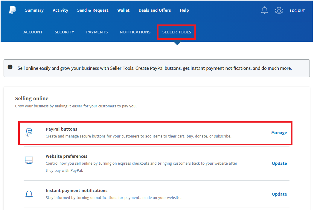 2. Seller Tools를 누르고 Paypal Buttons 관리로 간다.