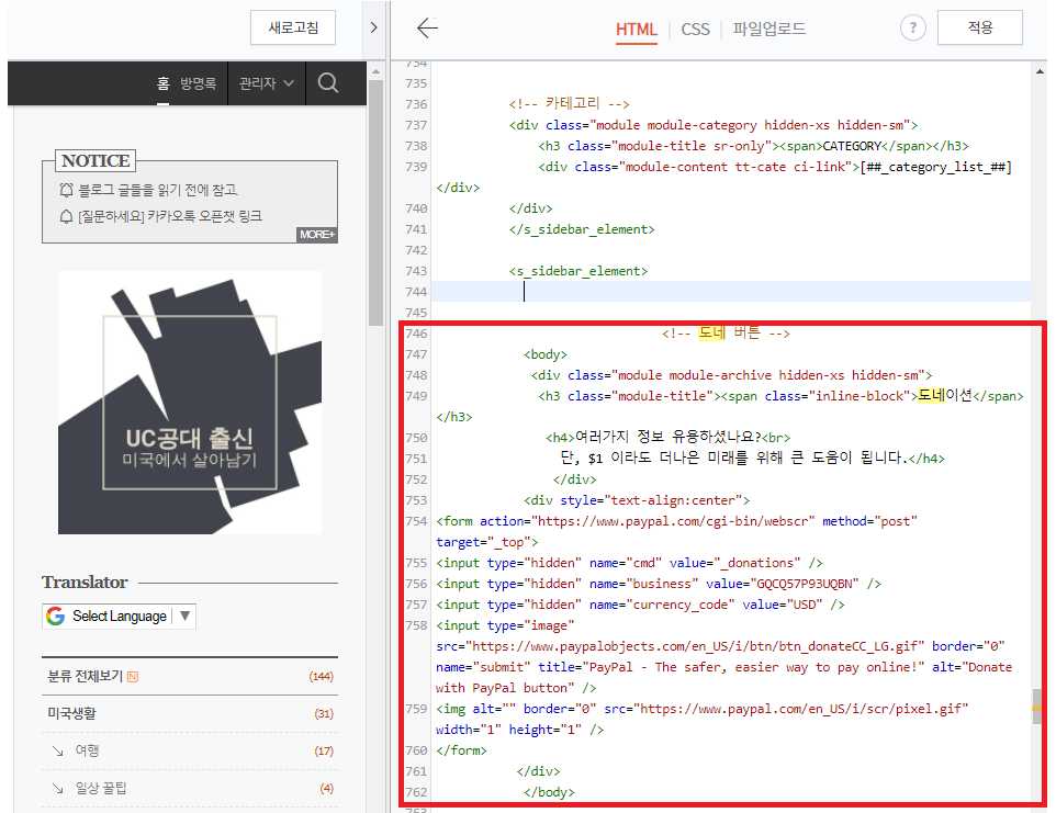 하지만 페이팔 도네이션 버튼이 필요하실 분이 있을까 해서 삭제 전에 블로그 Tip에 게시한다.