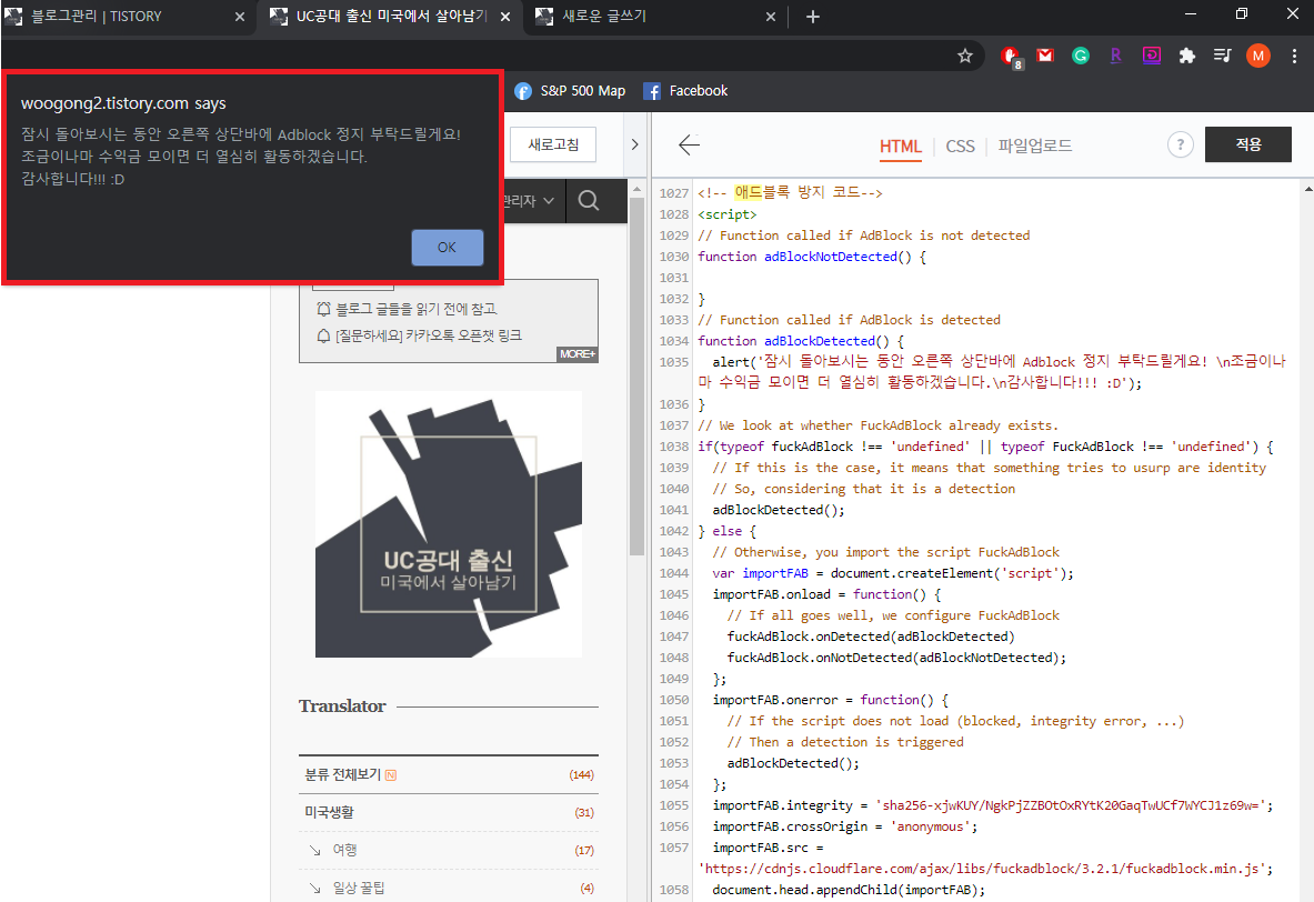 애드블록 플러그인을 사용 못 하게 막거나 경고창을 표시를 필요하다면 이글을 확인.