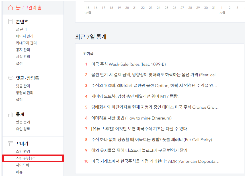 1. 티스토리에 로그인 후 스킨 편집->html 편집으로 간다.