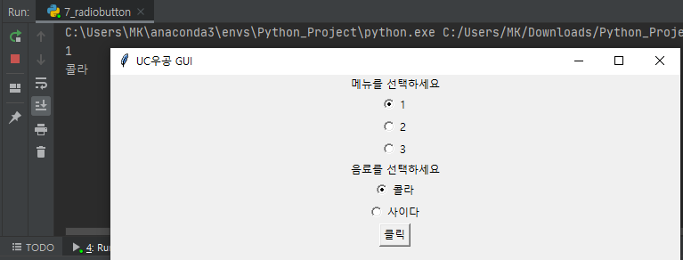 btn_drink1 = Radiobutton(root, text="콜라", value="콜라",variable=drink_var)