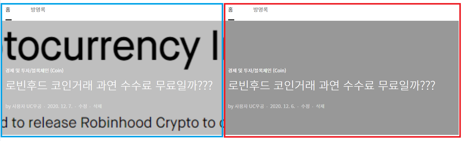 단순히 삭제한 것만으로도 본문 열람 시 제목을 읽기 어렵게 만드는 대표 이미지 효과는 사라지게 된다.