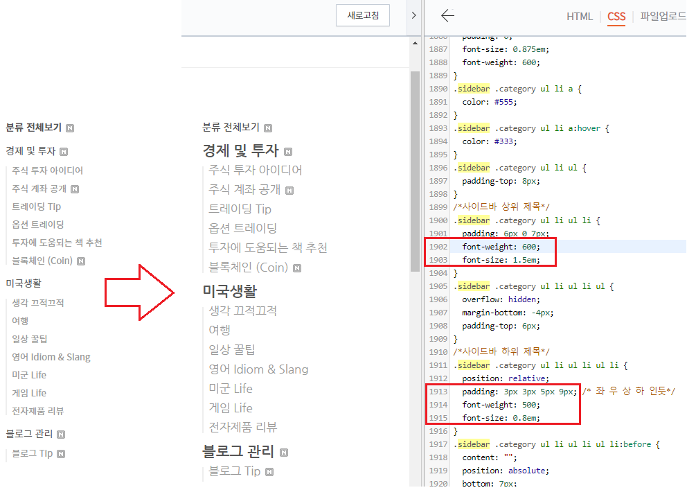 티스토리 html 편집으로 들어가 CSS 부분에서 Sidebar라고 검색을 한 후에 font size가 있는 부분을 하나씩 조절해보면서 원하는 사이즈와 padding을 찾아가면서 layout을 조정하면 된다.
