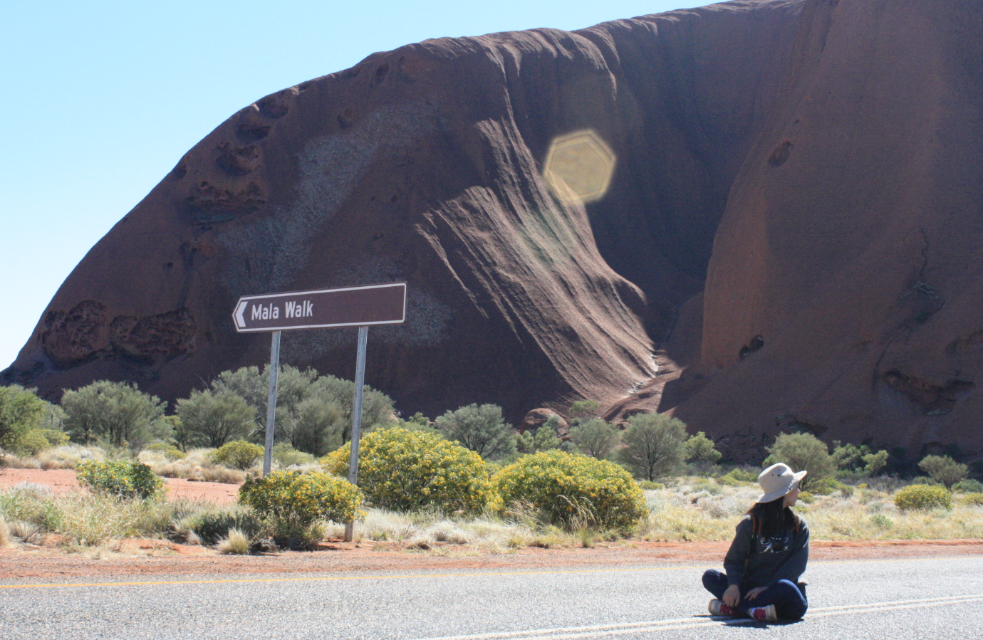 이렇게 도로 한가운데 누워서 사진 찍을 여유가 있었던 것 보면 Van을 렌트했거나 아니면 그냥 Drop-off 만 해줬던 여행패키지 같은데, 기억이 잘 나지 않는다. 봉고차 같은 Van에 탔던 기억이 어렴풋하게 난다. Ayers Rock 바로 근처에 숙소가 있는 게 아니라서 호텔이랑 캠핑지가 있는 지역에서 자동차로 최소 30분은 이동했던 거로 기억한다.