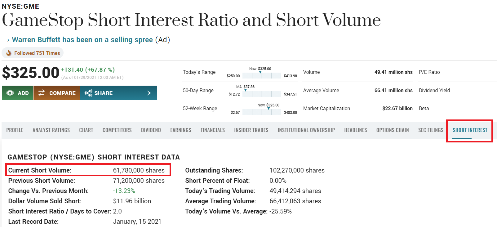 GME Short Interest Ratio (GameStop)
