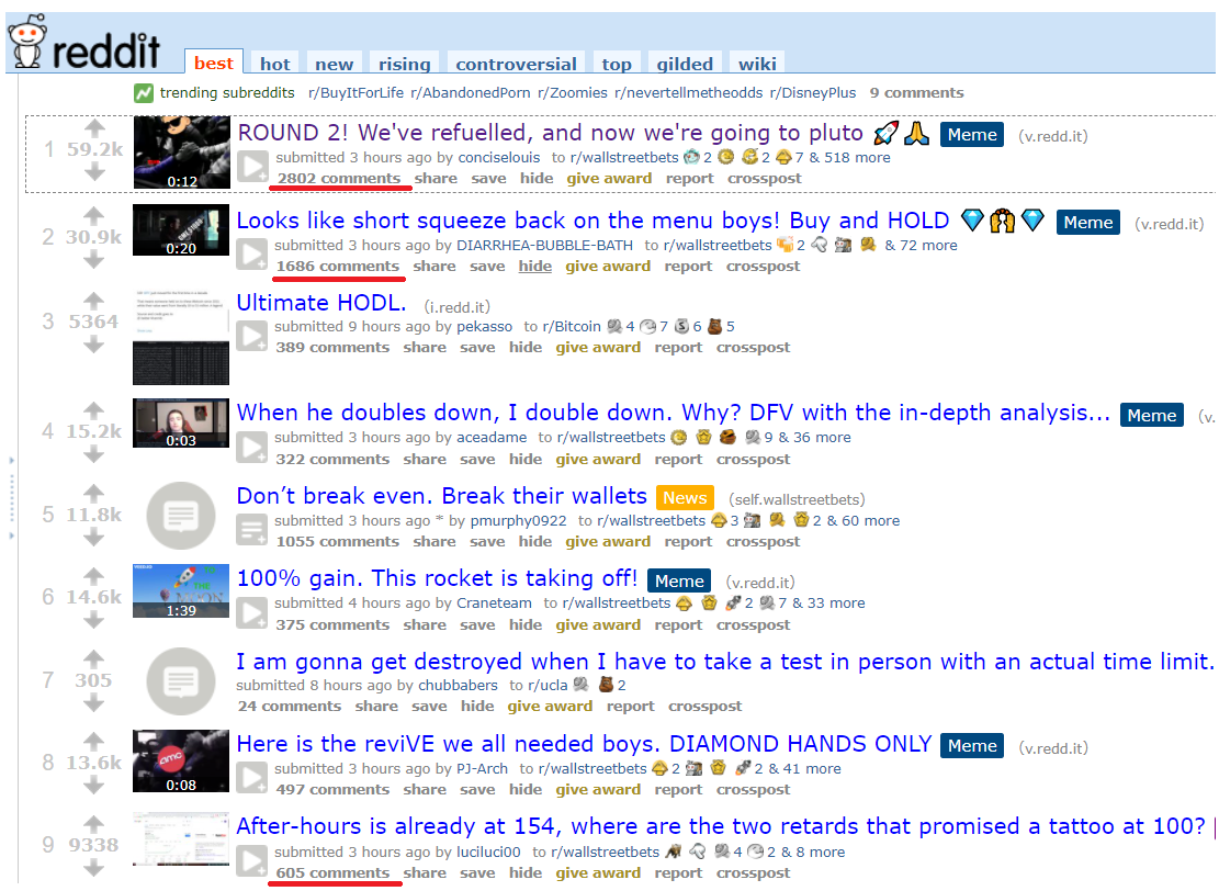매해 손실이 발생하고 심지어 21년 전반적으로 손실이 예상되는 가운데 2021년 2월 24일 갑자기 200% 게임스탑이 200% 폭등했다. 원인은 레딧에서 열렬한 지지를 받는 DFV(딥퍼킹벨류)가 추가로 게임스탑을 매수했다는 소식이 구독자 9백만 명이 넘는 레딧의 WSB채널에 퍼지면서 엄청난 매수세가 발생했다.