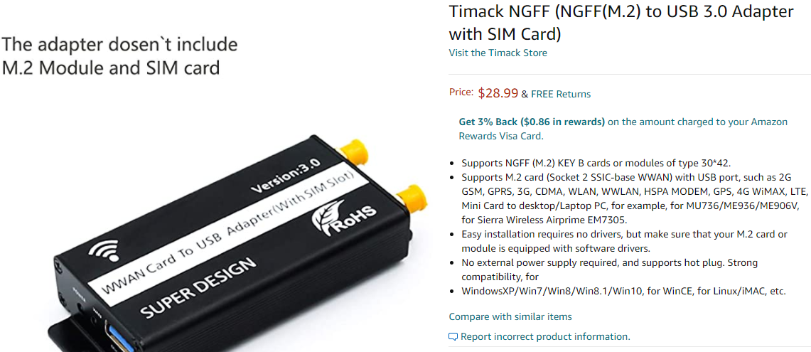 (특정 제품 광고 아님) 아답터 카드 구매 방법은 Ebay, 알리익스프레스, 또는 아마존에서 M.2 to USB with Sim Card라고 검색하면 여러 종류의 제품을 찾아볼 수 있다. 현재 시세로 카드 자체만 구매 시 $10~20 (1~2만원) 사이가 적당한 것 같고 안테나까지 달린 제품은 $30~40 정도면 (3~4만원) 적당하다.