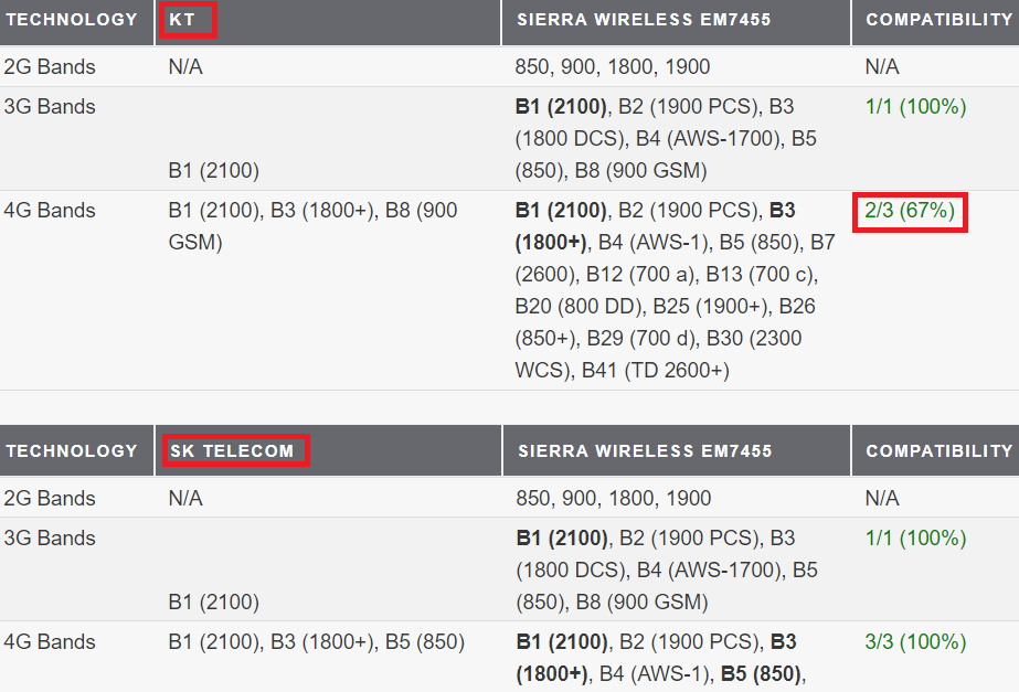 역시 SKT!! KT의 경우 B8 Band가 누락된걸 볼 수 있다. 만약에 특정 지역에서 B8(900Mhz)로만 서비스가 제공되는 지역이라면 EM7455 WWAN CARD로는 4G 통신망을 사용할 수 없다.