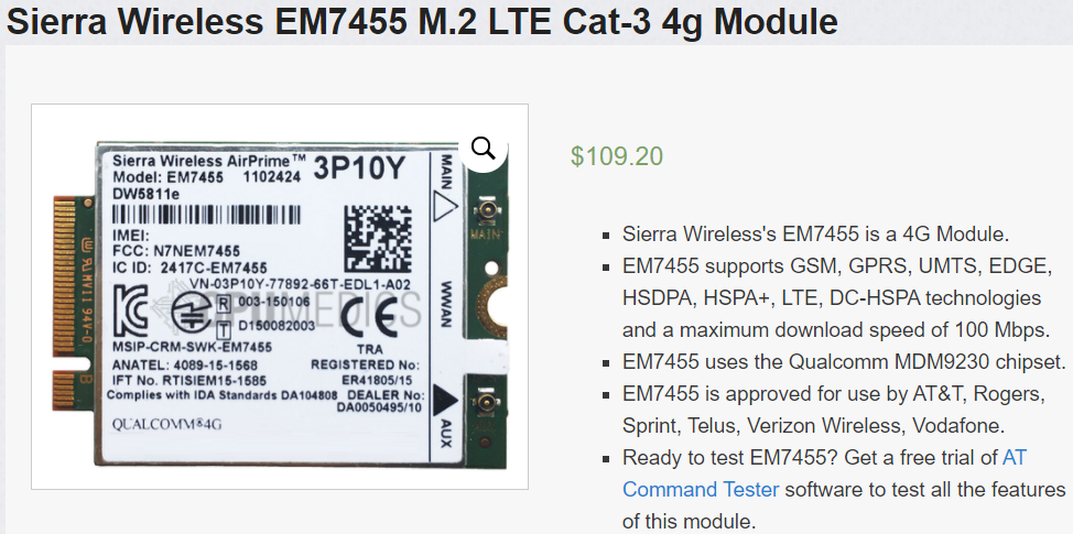 본인은 EM7455 제품을 골랐다. 구글링한 결과 최근 Ebay와 Amazon에서 물량이 가장 많고 주파수도 T-mobile과 가장 호환이 잘 되는 제품이다. 이런 제품은 주로 유심카드 슬롯이 탑재된 랩탑(노트북)에서 추출된다.