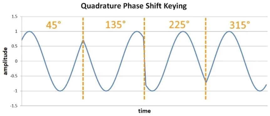 BPSK에서는 Phase 전환 시마다 0 or 1, 즉 1비트만 전송이 가능했다면 QPSK에서는 2비트 동시전송이 가능하다. Phase를 45, 135, 225, 315로 잘 틀어서 전송하면 00, 01, 10, 11 이 중에 4가지 정보를 한 번에 전송이 가능하다. 즉 동일 시간대비 BPSK에 4배나 많은 정보를 전송이 가능하다.