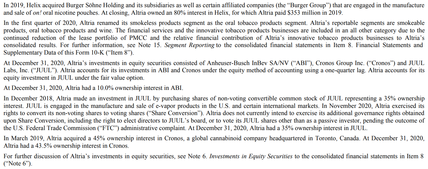 바로 위의 알트리아 2020년 연간보고서(10-K)가 있으니 다운받아서 Part 1 이라도 읽어보기를 추천한다. 하지만 귀찮아서 읽지 않을 걸 알기에 간단하게 아래에 설명하겠다.