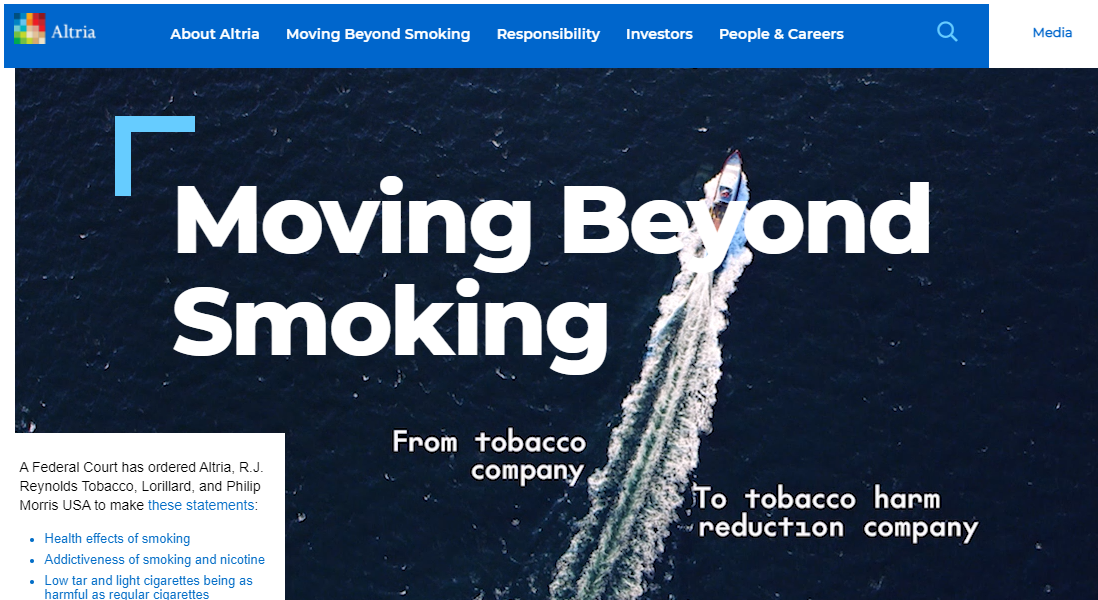 하루 이틀도 아니고 거의 수십 년째 FDA에서 담배규제를 계속해서 해왔고 전 세계적으로 흡연은 건강에 좋지 않다는 생각이 만연하게 퍼져있다. 또한 정부에서 담배회사에 세금 및 마케팅 등 여러 각도에서 강력하게 규제하다 보니 알트리아에서도 담배 매출 외에 다른 사업을 계속 확장해 왔다. 회사 홈페이지를 가보면 대놓고 담배회사 탈출하겠다는 의지를 보인다.