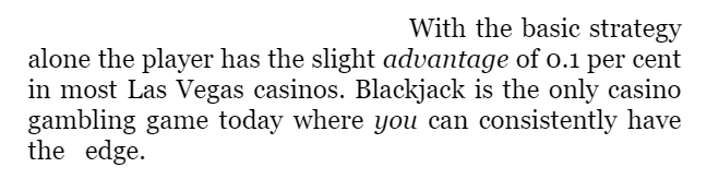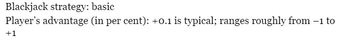 일반적으로 카지노에서의 게임들은 House Edge가 너무 크다. 그래서 게임을 하면 할수록 필연적으로 손실이 나게 된다. 또한 대부분의 게임은 감각적으로 플레이를 해야 한다. 하지만 다른 카지노 게임과 다르게 블랙잭은 최선의 수가 항상 존재한다. 딜러가 카드를 제공하는 동시에 Draw 또는 Stand를 해야 할지 고민한다면 블랙잭을 당장 그만해야 한다. 이와 같은 기본룰을 정확하게 숙지한다면 플레이어가 카지노보다 0.1% 확률의 우위를 가질 수 있다.