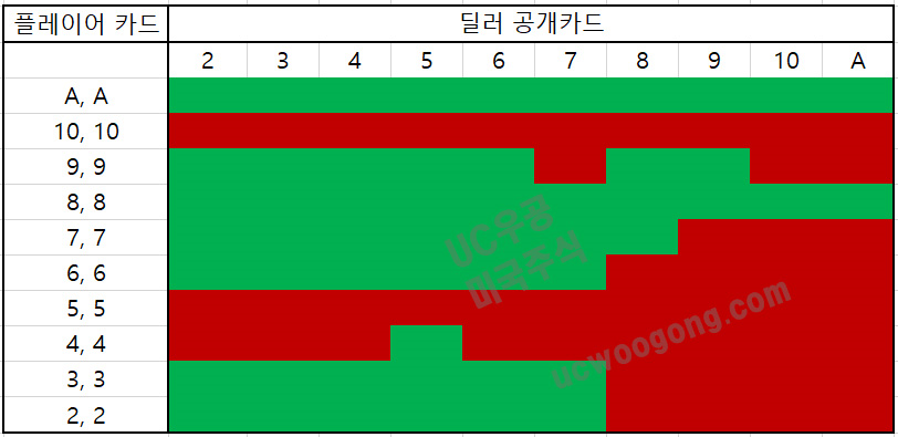 동일한 카드 두 장, 어떤 경우에 스플릿을 해야 하는가? 초록색으로 칠해진 경우라면 스플릿을 해야 한다. 빨간색 블럭이라면 스플릿을 하지 않고 Table 0에서 다음 노란색 칸으로 넘어간다.
