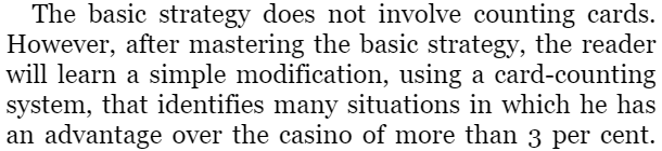 또한 추가적로 카드카운팅을 한다면 추가적인 확률 우위를 획득할 수 있다. 스포일러를 조금 하자면 카드 카운팅은 모든 카드를 외우는 기술이 아니다. 기본원리는 더하기 빼기여서 초등학생도 쉽게 카운팅을 할 수 있다. 특정 카드를 지정해서 그 카드가 나왔을 경우 제거해가면서 플레이어의 승률이 높을 때만 배팅금액을 올리는 방식이다. 책에서 이상적인 상황이라면 카지노를 상대로 3% 확률 우위를 점할 수 있다. $100불 배팅할 때마다 $3불이 플레이어의 주머니에 들어오는 확률이다.