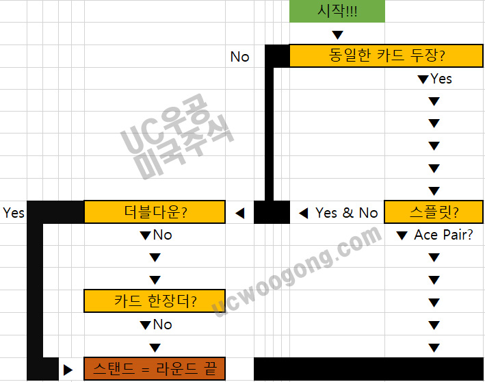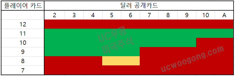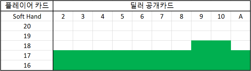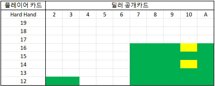 숫자의 합이 11 이하면 버스트 발생 확률이 없기에 무조건 추가 카드를 받아야 한다. 그리고 12부터는 10 카드를 받게 되면 버스트의 위험이 있으니 흰색 블럭영역에 포함된다면 스탠드를 해야 한다.