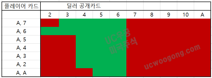 참고로 Ace 페어(A, A)의 경우 스플릿이 가능하다면 스플릿이 승률이 더 높다. 하지만, 스플릿이 되지 않는 카지노에서 딜러 카드가 5, 6일 경우 더블다운을 해야 한다.