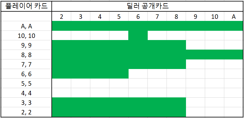 핸드가 페어로 들어오는 경우 아래 초록색 칸에 해당한다면 스플릿을 해야한다.