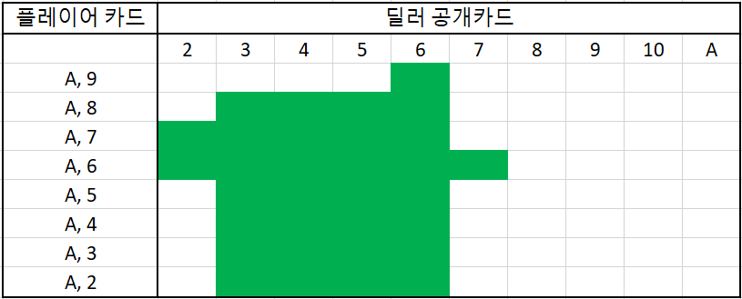 소프트 핸드로 아래 초록색 칸에 해당한다면 더블다운을 해야한다.