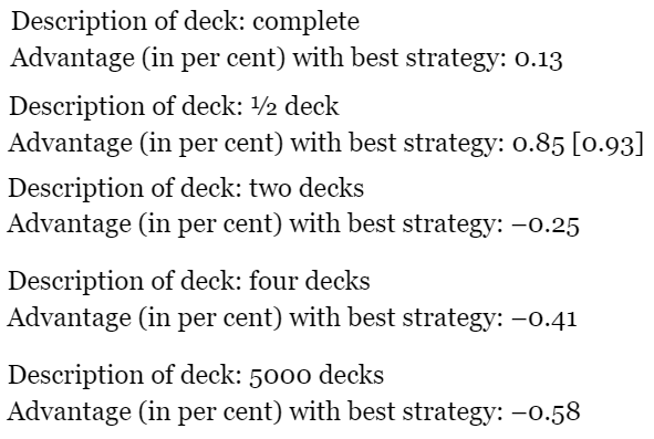 위에서 예시로 언급된 "7카드 2개 그리고 8카드 4개만 남는다면" 극적으로 플레이어에게 확률의 우위 (Advantage)가 주어진다. 남아있는 모든 카드를 외우는 것은 어려우니 카드를 제외하면 플레이어의 승률에 어떻게 영향을 미치는지 알아보자.
