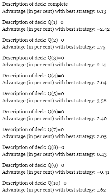 위에서 예시로 언급된 "7카드 2개 그리고 8카드 4개만 남는다면" 극적으로 플레이어에게 확률의 우위 (Advantage)가 주어진다. 남아있는 모든 카드를 외우는 것은 어려우니 카드를 제외하면 플레이어의 승률에 어떻게 영향을 미치는지 알아보자.