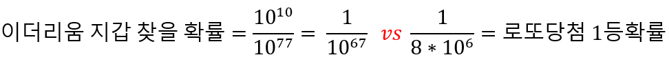 (8 * 10^9)을 대략 (10^10)으로 두고 (1.1579 * 10^77)을 대략 (10^77)으로 두고 계산하면 대략 (10^10)/(10^77) = (10^-77). 로또 당첨확률이 약 8백만분의 1이니 (8 * 10^-6), 이걸 감안한다면 현실적으로 로또를 구매하는 방법이 더 빠르게 부자가 되는 방법이다. (결론이 이상하게.......)
