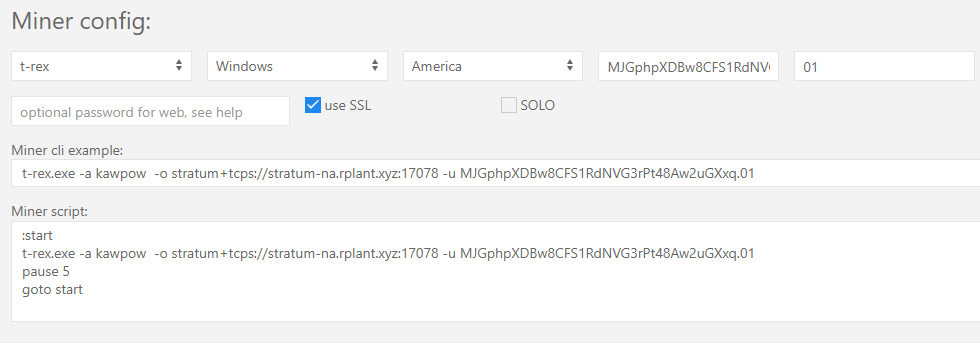 T-rex, Window 그리고 대략적인 거주지역, 지갑 주소, 마이너가 여러 개라면 01,02,03... 이렇게 숫자 입력하면 된다.