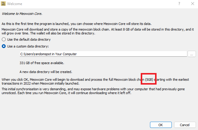 자 이제 지갑 Sync를 위한 5GB의 저장공간이 필요하다. 저장은 Default Data Directory로 해도 되고 본인이 원하는 곳이 있으면 직접 지정해도 된다. (기본 설정 추천한다.)
