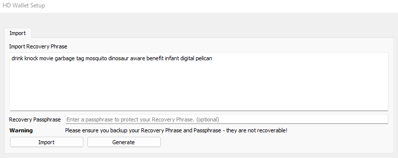 지갑을 생성하면 아래와 같은 복구키가 (Recovery Phrase) 주어진다. 이 복구키는 은행 비밀번호 같은 거라서 누구에게도 공개하지 않고 잘 적어서 보관하도록한다.