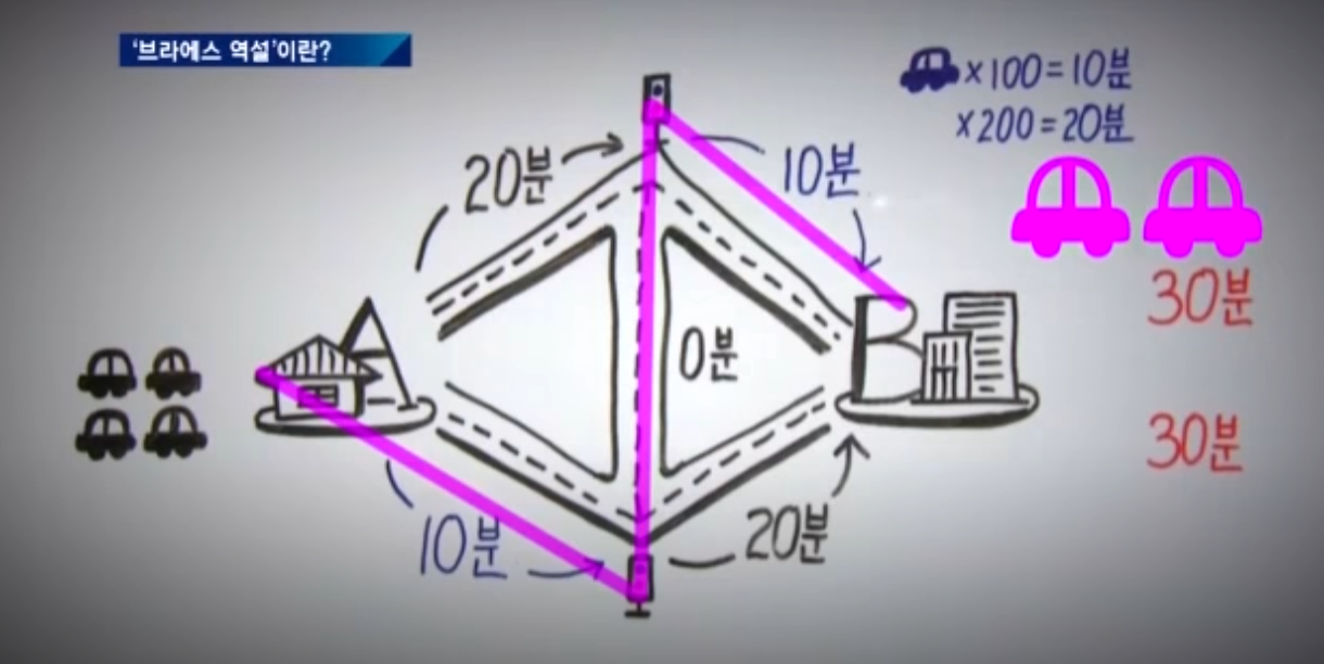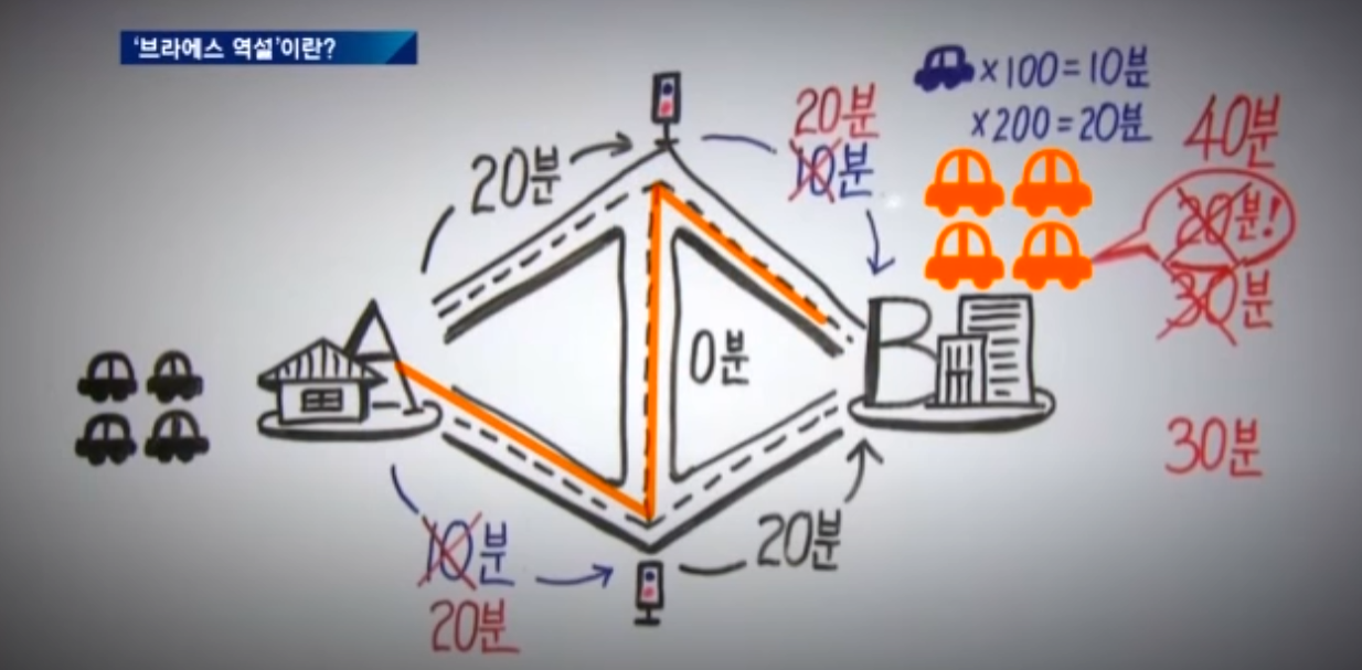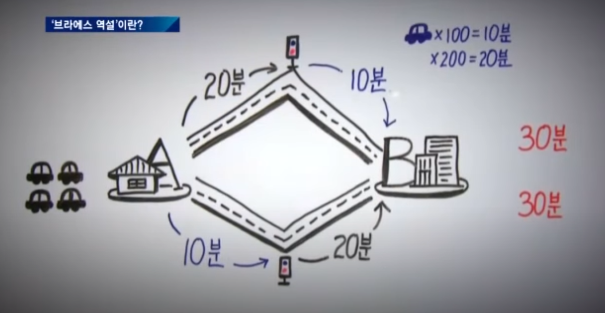 도로는 "통제를 해야" 길이 덜 막힌다? 얼핏 들으면 말이 안 되는 소리 같아 보인다. 하지만 브라에스의(Braess) 역설에 따르면, 일부 경우에는 추가적인 도로를 건설하거나 기존 도로를 통제할 때, 도로 전체적인 흐름이 더 나빠질 수 있다. 이는 개별 차량이 최적의 경로를 선택하기 위해 자유롭게 움직일 수 있는 상황에서 발생하는 현상으로, 개별 차량이 최단 경로를 택할 때 전체적인 교통 흐름이 최적화되는 것과는 상반된다.