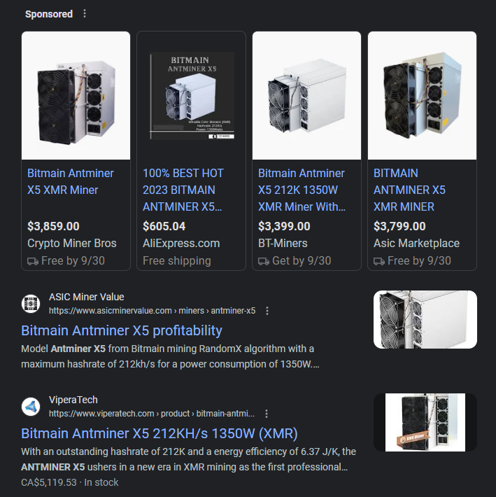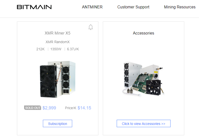 앤트마이너로 유명한 비트메인 채굴기 공식 판매 홈페이지인 비트메인 쇼핑몰에 XMR Miner X5라고 떡하니 등록되어 있다. 현재 완판되었다고 나오는데 가격은 $3,000 이다.