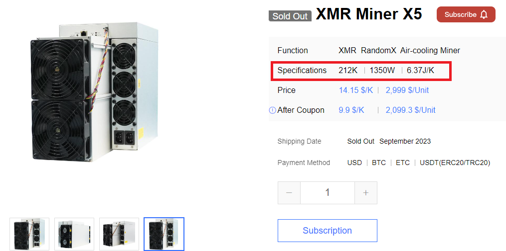 앤트마이너로 유명한 비트메인 채굴기 공식 판매 홈페이지인 비트메인 쇼핑몰에 XMR Miner X5라고 떡하니 등록되어 있다. 현재 완판되었다고 나오는데 가격은 $3,000 이다.