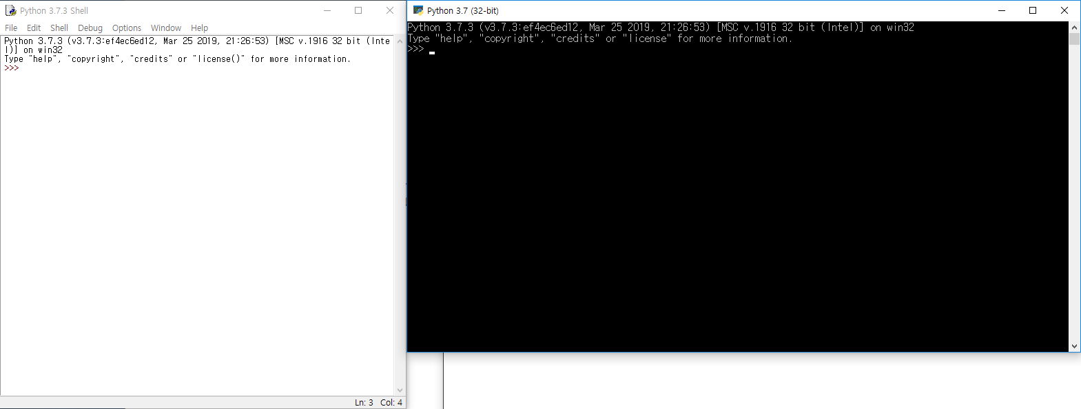 설치 완료 하고 파이썬을 실행해보면 아래와 같이 두종류의 창으로 열수있습니다.